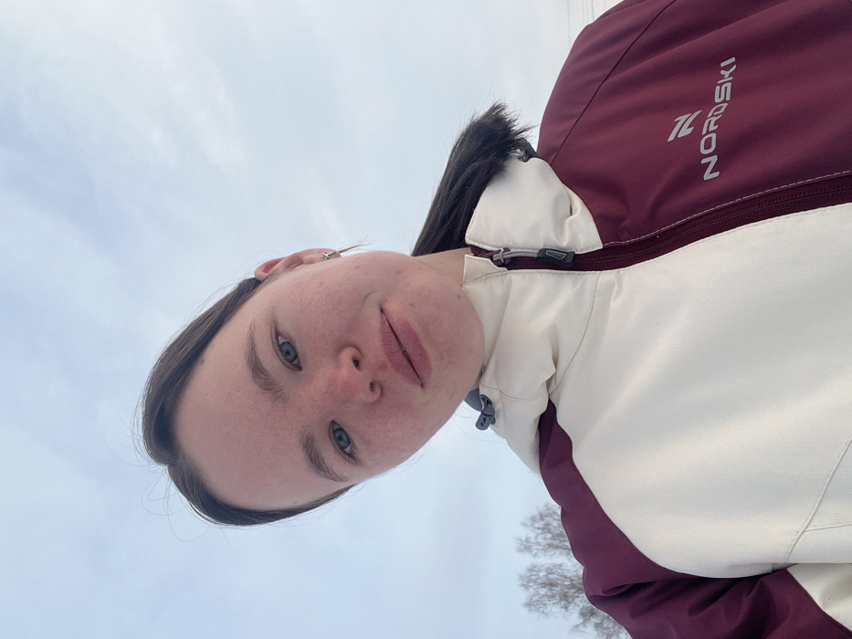 An outdoor portrait captured in the city of Сергино, Russia, features a young adult female from a low-angle perspective. The subject has fair skin with some visible redness on her cheeks and nose, blue eyes, and dark hair pulled back from her face, with a section visible over her right shoulder. She wears a small, silver star-shaped earring in her visible right earlobe. Her lips are full, and her expression is neutral with a slight upturn at the corners of her mouth. She is wearing a two-tone winter jacket, cream-colored on the right side and maroon on the left side, featuring a central silver zipper. The brand "NORDSKI" is visible in silver text on the maroon portion of the jacket. The background consists primarily of a light blue sky with scattered faint white clouds. In the lower left quadrant of the background, the bare branches of several deciduous trees are visible against the sky.