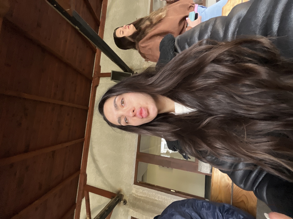The image captures three individuals within an indoor or semi-sheltered area in Sofia, Bulgaria, characterized by a visible wooden ceiling and light-colored walls. In the foreground, a female subject with long, dark brown hair looks directly at the camera, her lips pursed in a "kiss" expression. She wears a white ribbed knit top under a black jacket with a dark faux-fur collar. To her right, a second female subject is partially visible, facing away from the camera, wearing a brown long-sleeved top and holding a light-colored smartphone with a pink case in her left hand. On the far left, a third individual's arm and shoulder, clad in a navy blue puffer jacket, are partially visible. The overhead structure consists of dark brown wooden planks and exposed beams. Light-colored, possibly off-white, textured walls are visible behind the subjects, with a double glass door featuring dark frames visible in the mid-ground to the left.