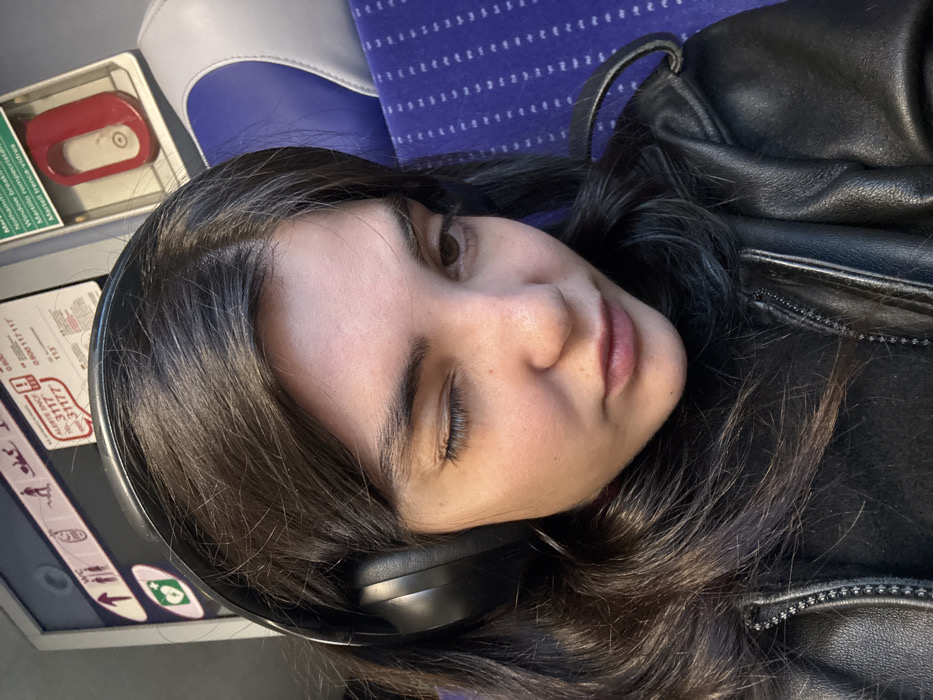 - "A woman with dark hair and headphones rests her head against a train seat" by FM-kZ4ZN2, licensed under CC BY 4.0