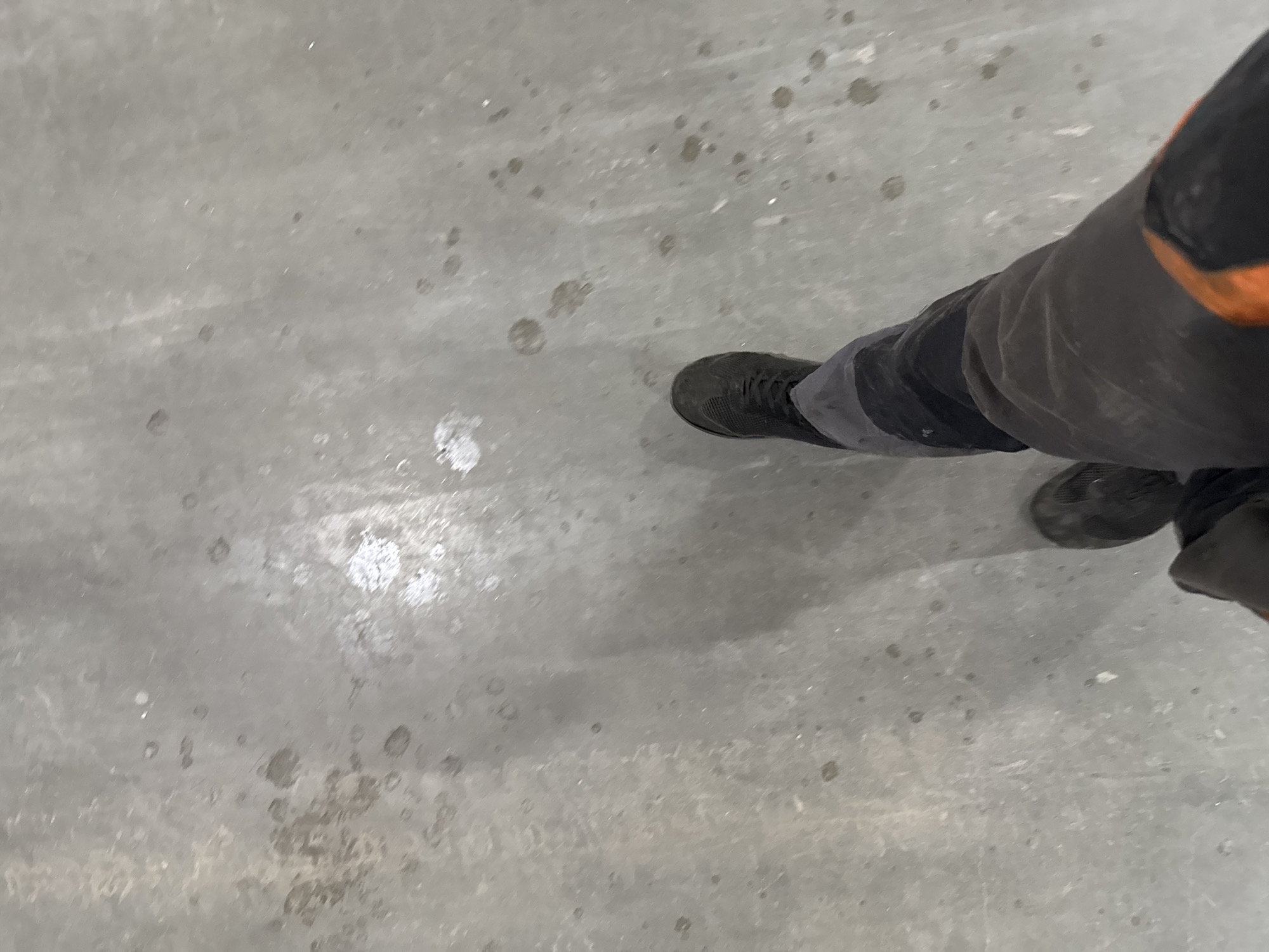 A view from above, focusing on a gray concrete floor and a person's legs and feet