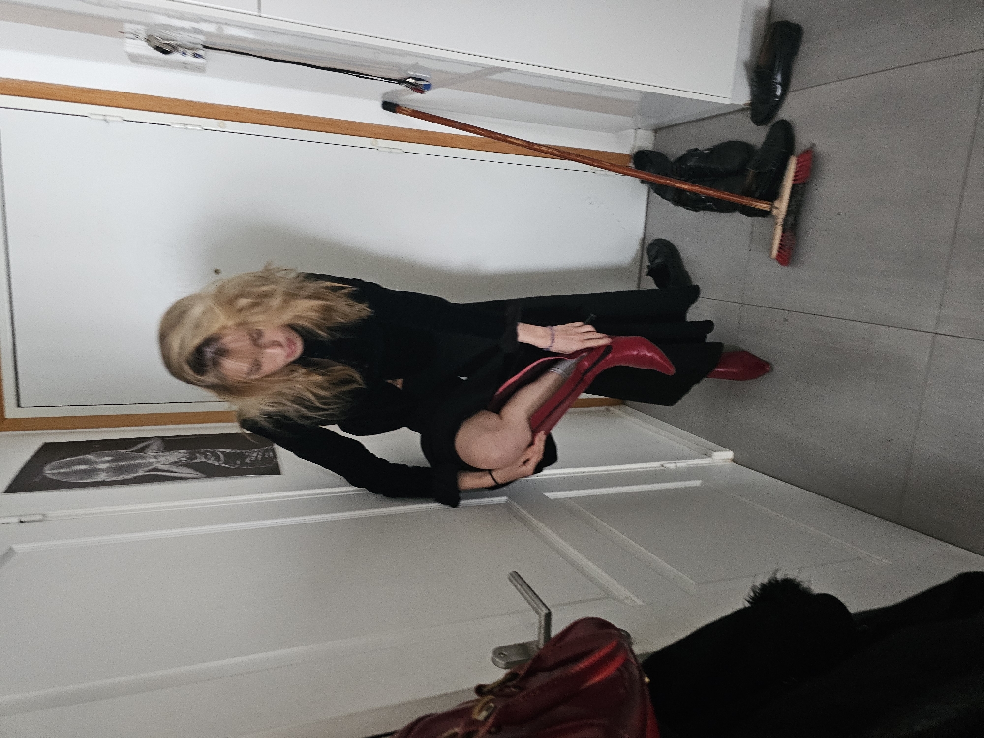 An indoor scene in what appears to be an entryway or hallway of a residence in Pantin, France. A blonde-haired individual, likely female, wearing a black long-sleeved garment and a black skirt, is positioned in the center-right of the frame, facing downwards. The individual is in the process of putting on a red, pointed-toe, high-heeled boot on their right foot, with the left boot already on. The right leg is bent, with the knee visible. A burgundy or dark red handbag with a gold-colored clasp is partially visible on the left, hanging near a white door with a silver handle. The floor is tiled with light grey square tiles. To the right of the individual, a wooden-handled broom with red and black bristles rests against the wall. Several pairs of dark-colored, flat shoes are scattered on the floor near the broom. The walls are white. A second white door is visible behind the individual, and to its right, a wooden door frame is present. Hanging on the white wall to the right of the second door frame is a white electrical outlet or fixture with a black cable and a cluster of keys attached. On the white wall to the left of the individual, a dark, vertical piece of art or poster depicting an abstract or biological form is visible. The lighting appears even, suggesting an indoor light source.