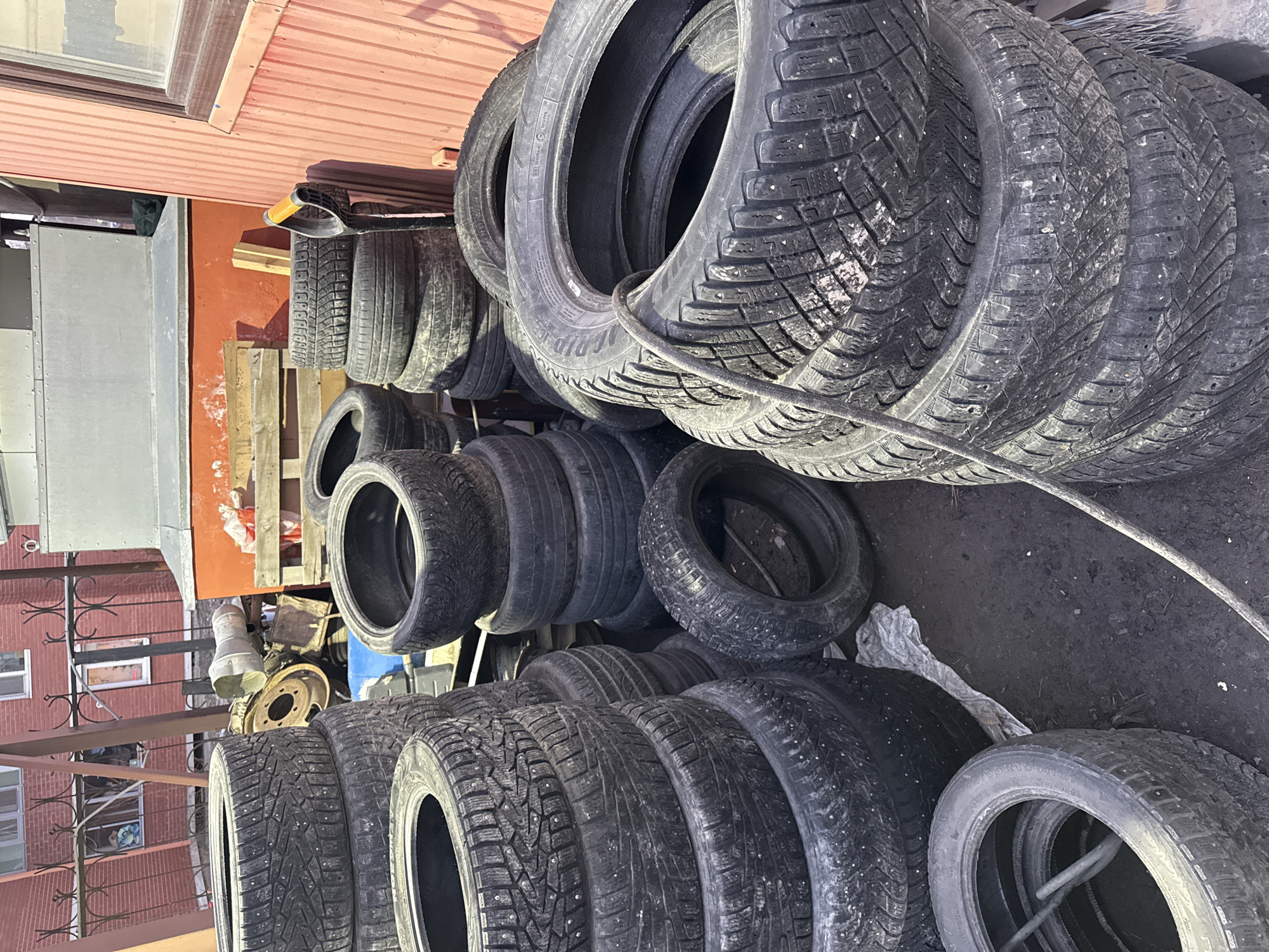A large number of used car tires are piled up in an outdoor storage area. The tires are of various sizes and tread patterns, including some with winter studs. The storage area appears to be near a building with corrugated metal siding and a window. The location is Yekaterinburg, Russia. The overall scene suggests a tire storage or recycling facility.