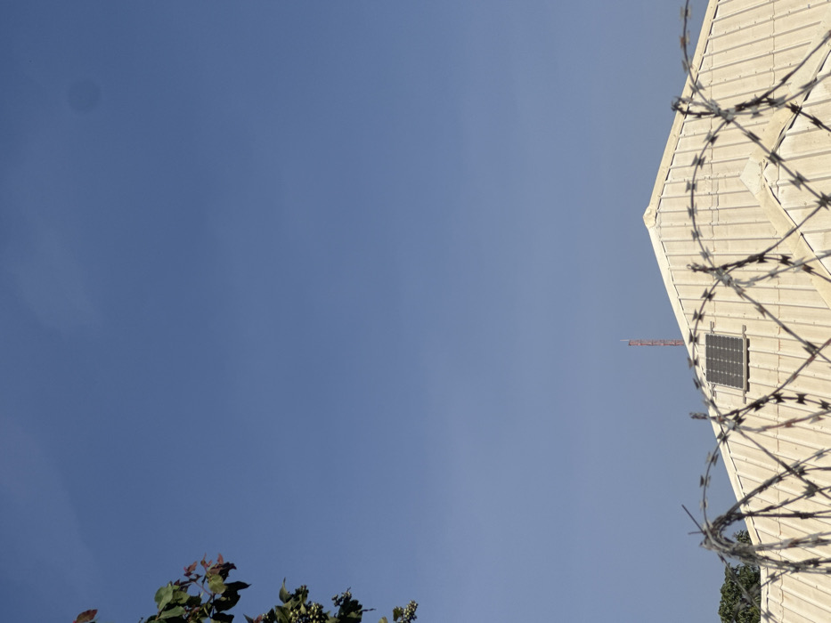 The image, captured in Jos, Nigeria, presents an upward view dominated by a clear, light blue sky, which occupies approximately the upper two-thirds of the frame. A faint, dark circular artifact is visible in the upper right quadrant of the sky. In the upper left, a cluster of green leaves with some reddish coloration and light green berries partially extends into the frame. The lower half of the image features a light-colored, likely beige or pale grey, corrugated metal gable roof. A single, dark, rectangular solar panel is mounted on the roof, positioned left of the central peak. In the distant background, a slender, reddish-orange lattice tower rises above the roofline against the sky, slightly to the left of center. The immediate foreground is traversed by multiple strands of dark, metallic concertina razor wire, which cast shadows and partially obscure the roof. No individuals, discernible actions, or direct interactions are visible within the scene.