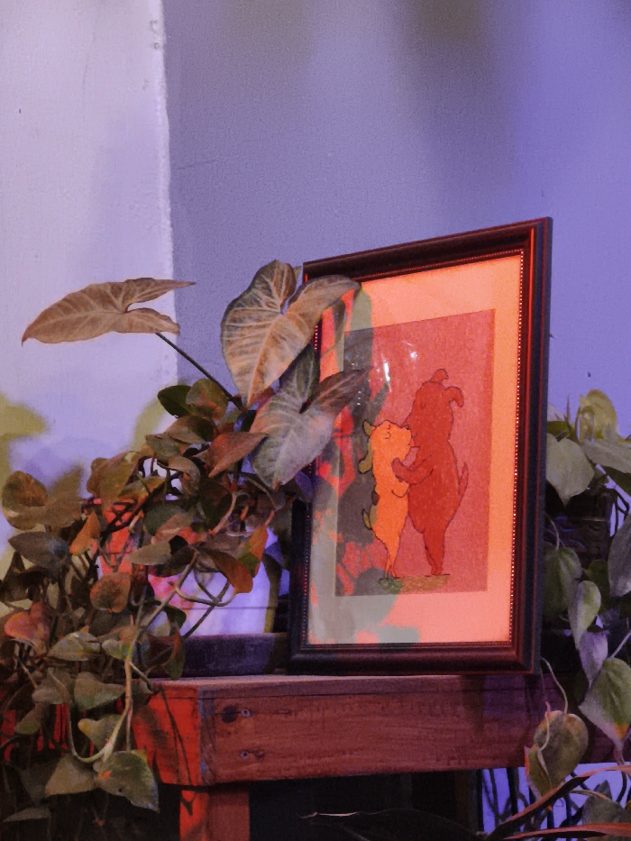 A framed cartoon drawing of two dogs in contrasting yellow and red hues is placed on a wooden shelf. The dogs are depicted in an embrace. The background of the drawing is a warm red. Lush green plants, including a syngonium with heart-shaped leaves, flank the framed picture on either side. The scene is illuminated by a purple light.