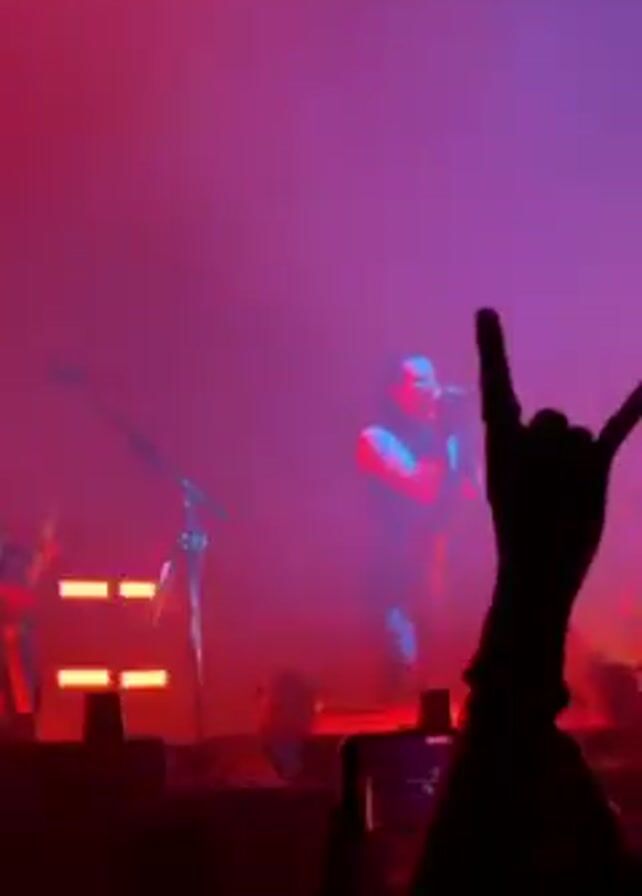 A concert-goer records a performance on their phone. The stage is lit with dramatic pink and red lights. A singer in a black vest and pants stands center stage at a microphone. Another person plays guitar on the left side of the stage. The concert attendee makes the rock-and-roll hand gesture towards the stage. Many other audience members can be seen.