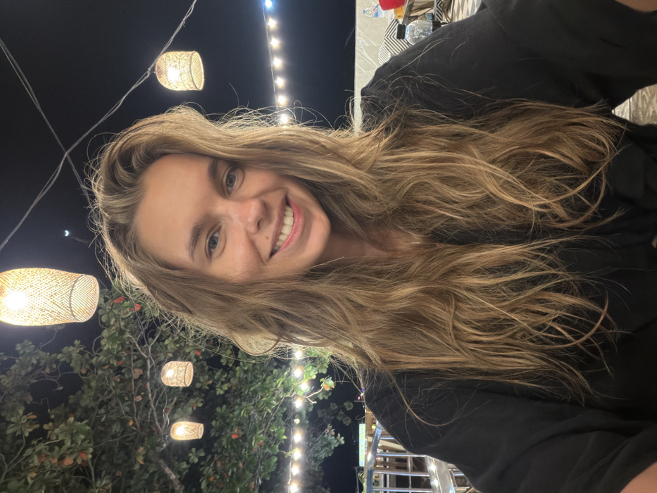 The image displays an adult female centrally positioned, smiling directly into the camera. She has long, wavy brown hair, light skin, and blue eyes, and is wearing a dark, long-sleeved top. The scene is set at night, illuminated by several woven-style pendant lights suspended from above, with some appearing to hang from tree branches visible on the left. A string of smaller, warm-toned bulb lights spans the background. A faint crescent moon is visible in the dark sky. On the left, a partial wooden railing structure with horizontal slats is present. On the right, indistinct elements suggest outdoor furniture, including what appears to be a checkered pattern surface, a dark bottle, and a red object. The location is an outdoor dining or lounge area in Rawai, Thailand.