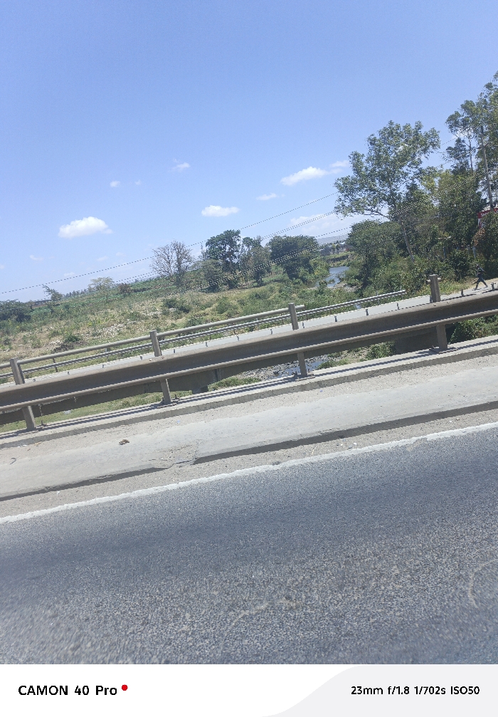 A slightly tilted shot shows a highway alongside a bridge over a river. The guardrail of the bridge is prominent, with greenery and trees visible on the riverbank. Powerlines stretch across the blue sky. On the right side of the bridge, a person is walking. The highway pavement takes up a large portion of the foreground, with the horizon slightly tilted.