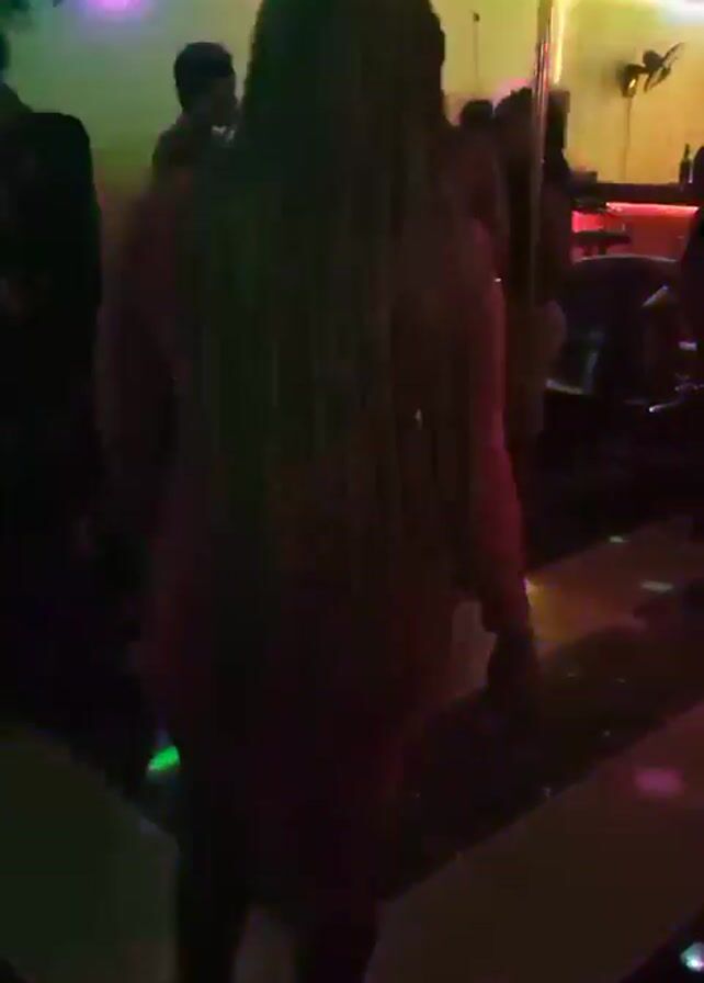 The video appears to be recorded indoors, likely in a bar or club. Several people are present, mostly women, moving around in a dimly lit space with colored lights. Some of the women are wearing dresses. A pole is visible in the center, suggesting a possible dance or performance area. The environment seems social, with music or ambient noise likely present.