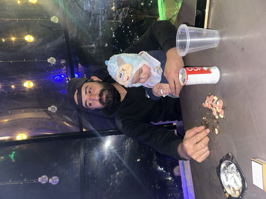 A man in a black hoodie and baseball cap cradles a baby in a blue hat. They are seated at a table with a clear plastic cup, a can, and a scattering of nuts and seeds. An ashtray with cigarette butts and a pack of cigarettes are also visible. The background features string lights and a dark, reflective surface, possibly a window or enclosure.