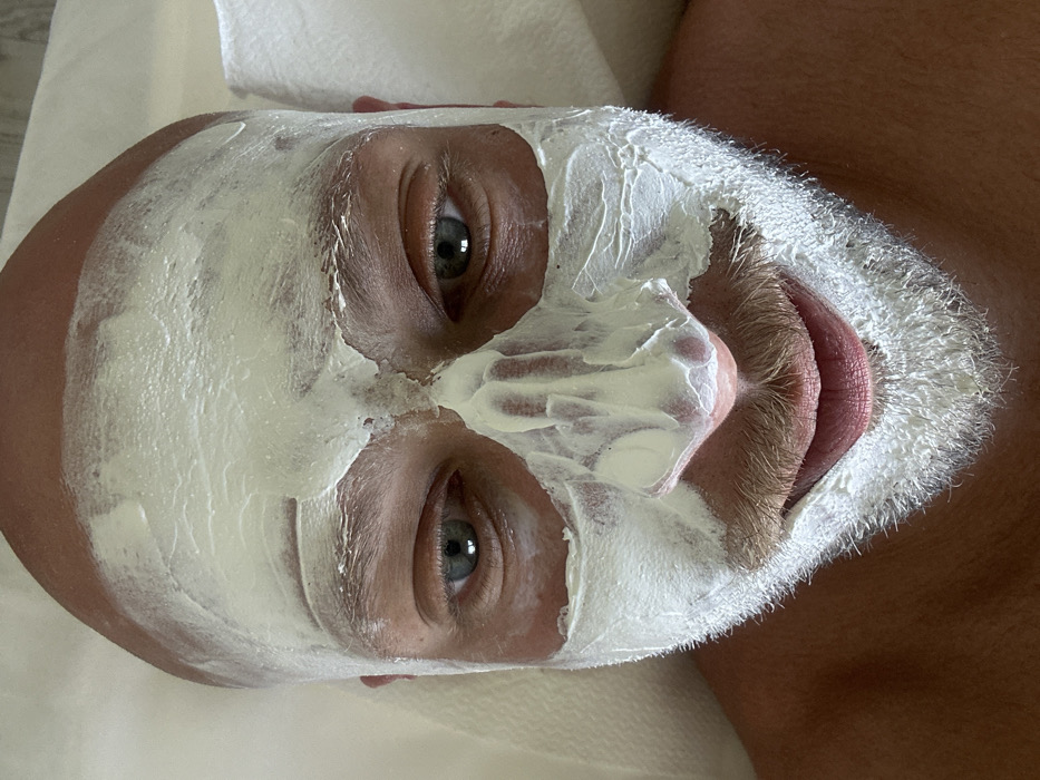 A close-up, overhead image captures the face of an adult male receiving a cosmetic treatment