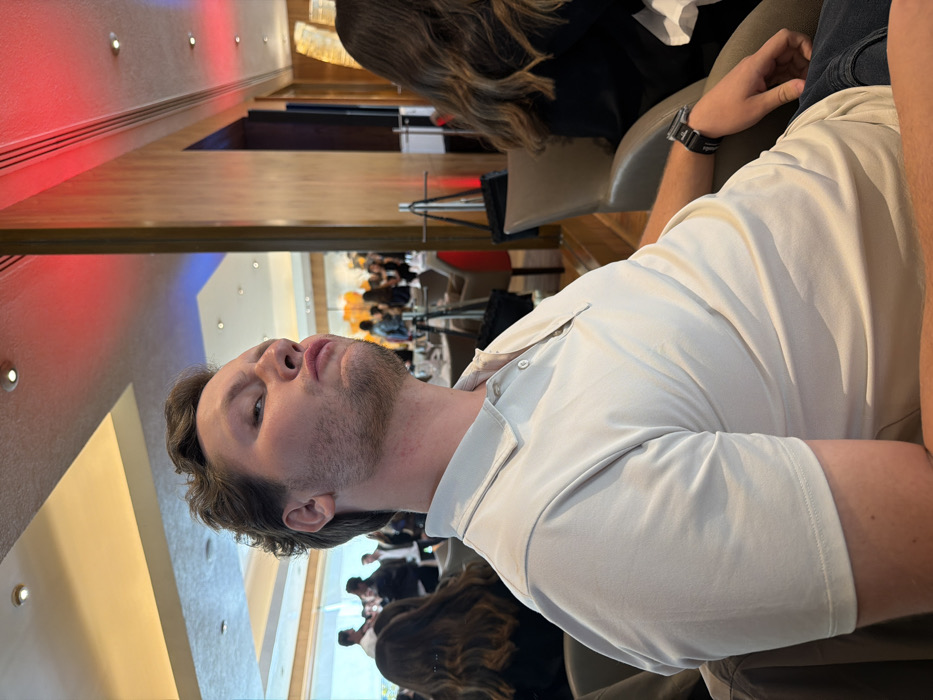 A man in a tan polo shirt sits in a chair. He has short brown hair and stubble. He wears a watch on his left wrist. Other people are sitting behind him in the background, with tables set up for a meal. The lighting in the room is bright with red and blue colored lights. The man appears to be looking up and away from the camera.