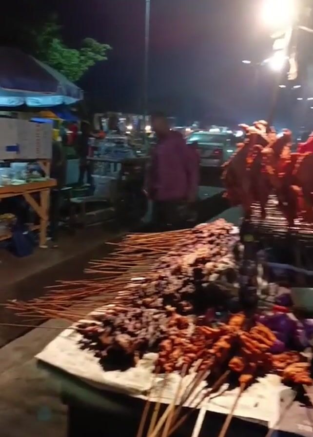 nighttime street scene with a food stall. A young man stands behind a table covered with various cooked meats on skewers. Some skewers hold dark, grilled pieces, while others have vibrant red meats. Behind him, a rotating grill holds more of the red meat. On the table, there are onions, a green bowl, and a credit card terminal. In the background, other stalls are visible with people milling around under streetlights. The environment appears to be a bustling outdoor market or food area.