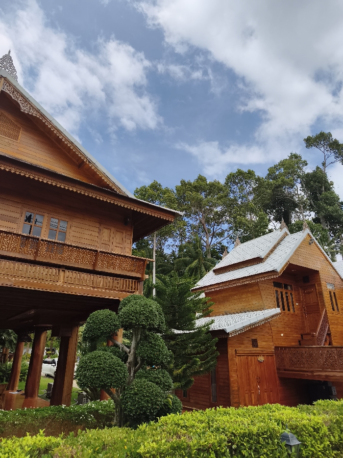 Two traditional wooden Thai buildings stand among lush greenery beneath a sky dotted with white clouds. The building on the left is elevated on pillars, featuring intricate wooden carvings on its balcony. The building on the right is closer to the ground, with a visible staircase leading to its entrance. The landscaping includes meticulously shaped shrubs and a neatly trimmed hedge in the foreground.