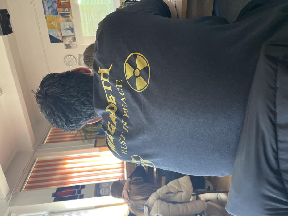 The image captures a classroom scene in Panagyurishte, Bulgaria, from a rear-facing perspective, primarily focusing on the back of a seated student. The central figure, a person with short, dark hair, occupies the immediate foreground. They are wearing a black short-sleeved t-shirt featuring yellow text that reads "MEGADETH" above "RUST IN PEACE," flanked by two circular yellow nuclear radiation hazard symbols. This individual is seated on a chair with a dark, possibly padded, backrest. To the left of the main subject, another student with long, light brown hair is visible from the back, seated at a wooden desk. A light-colored puffer jacket is draped over the back of a chair to the left of this student. Bright sunlight streams through two tall windows on the left wall, which are fitted with orange and white vertical blinds. In the background, a white wall displays a circular analog clock with black numerals, indicating approximately 1:50. Below the clock, a white projection screen shows green-tinted text, suggesting an active presentation or lesson. Above the screen, a row of small, framed artworks or posters is visible, depicting various scenes including a tree silhouette and abstract landscapes. A black projector is mounted on the white ceiling in the upper right corner, casting light onto the screen. The classroom walls are predominantly white.