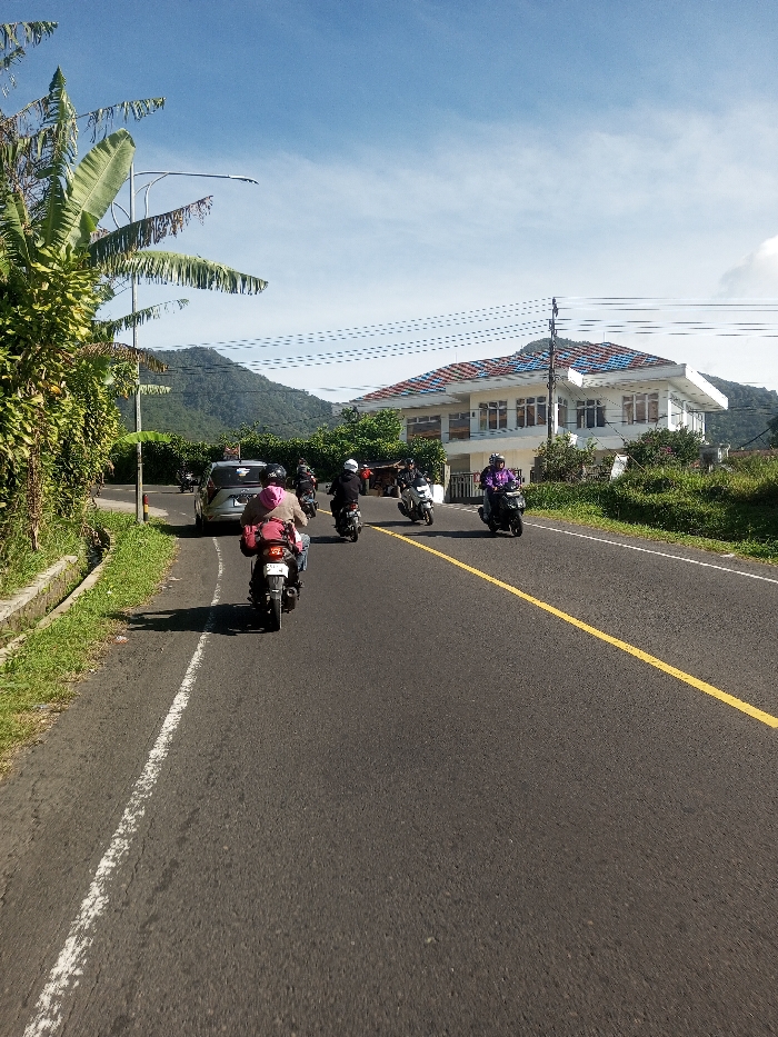 A sunny daytime scene in Ka Thaung (Upper), Myanmar, depicts an asphalt road under a clear blue sky with minimal white clouds. The road features a solid white line marking the left shoulder and a solid yellow center line. Dense green vegetation, including banana plants, lines the left side of the road. On the road, a group of at least seven motorcycles and one silver sedan are observed. The closest motorcycle, seen from the rear, is dark-colored with a rider wearing a pink hoodie and a red bag secured to the rear seat. Ahead, a silver sedan is partially visible on the left side of the road. Several other motorcycles, with riders wearing helmets, are traveling away from the viewer, primarily on the right side of the yellow line. One dark-colored scooter, ridden by an individual wearing a purple jacket and helmet, is approaching the viewer's position. In the mid-ground right, a two-story white building with a distinctive multi-colored tile roof (red, blue, and white segments) is prominent. Green, tree-covered mountains rise in the far background. Utility poles with overhead wires are visible spanning the scene above the road and building.
