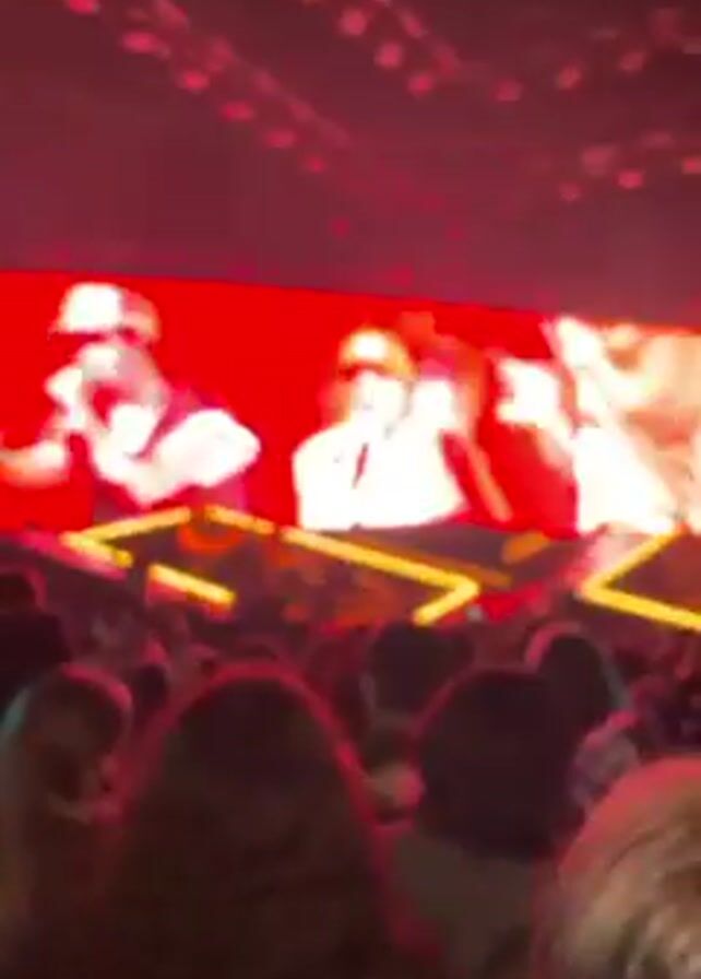 concert from the perspective of someone in the audience. The stage is lit with vibrant, changing colors, including blue, red, and white. The performance seems to be a duo, although details are unclear due to the distance and lighting. A large screen behind the performers displays close-ups of them, enhancing visibility for the audience. The audience is dense, with heads visible in the foreground. The concert setting suggests a lively, energetic atmosphere.