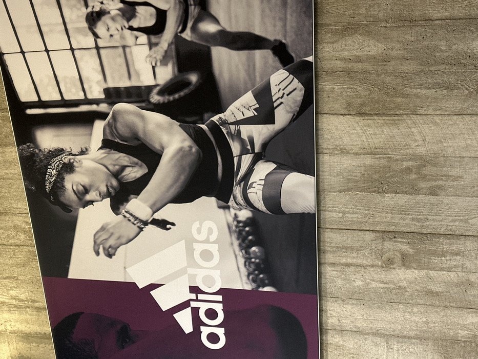 The image displays a large, vertical Adidas promotional poster mounted on an interior wall in Herzogenaurach, Germany