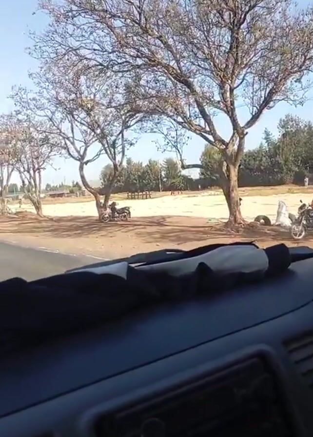 view from inside a vehicle driving on an asphalt road on a sunny day. On the right side of the road, there is a sandy area with two bare trees casting shadows. Two motorcycles are parked in the shade of the trees. A few people are walking around in the sandy area and further in the background, there are more trees and some buildings. The foreground shows the dashboard of the vehicle.