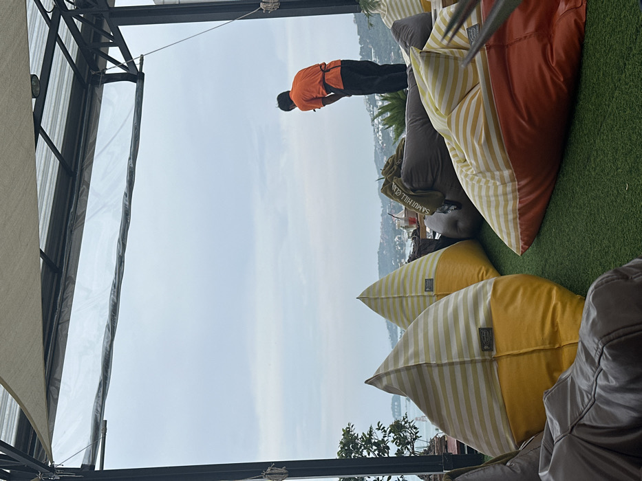 The image depicts an elevated outdoor seating area, likely a cafe or lounge, located in บ้านบางรักษ์, Thailand