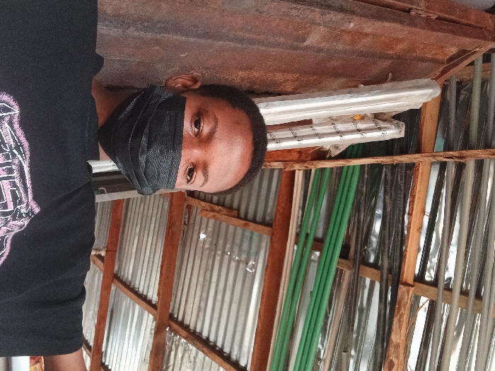 The image presents a headshot of an individual with dark skin, positioned centrally, wearing a black disposable face mask that covers the nose and mouth. Their eyes are visible above the mask, directed towards the camera. They wear a black short-sleeved t-shirt with a multi-colored graphic design visible on the lower chest. The background, suggesting a semi-enclosed, utilitarian space, features diverse materials. To the individual's left, a rusted, corrugated metal sheet forms a vertical surface. To the right, two elongated items, likely light fixtures, wrapped in clear plastic, lean vertically against the background. Further to the right and above, a makeshift roof structure is visible, comprising wooden beams supporting corrugated metal sheets, some new and others weathered. Below this roofing, a bundle of green pipes is horizontally stacked, interspersed with other dark, long objects. The overall environment suggests a storage area for construction materials or an informal workshop. The specific location within the city of Kubwa, Nigeria, cannot be visually determined from the image.