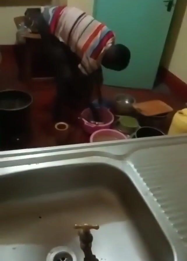 A person in a striped shirt is shown washing dishes on a red floor. They are standing over several basins filled with water and dishes. A stainless steel sink is in the foreground with a faucet turned off. The floor is also littered with pots, pans, and other kitchen items. In the background, a closed light blue door is visible. The person is using a dark colored object to stir the water in the basins. The video seems to be taken from a fixed position, focused on the sink, while the person washes dishes in the background.