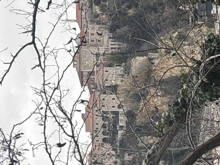 The image presents a panoramic view of the Old Town of Ulcinj - Ulqin, Montenegro, captured from a distant, elevated perspective under an overcast, grey sky. The central focus is a cluster of historic stone buildings with distinct red-tiled roofs, perched atop a steep, rocky promontory in the midground. The architecture is characterized by light-colored stone masonry, numerous rectangular and arched windows, and multi-level structures. A prominent feature is a square stone tower with several arched openings, located slightly right of the center. To its left, another building displays an arcaded upper-level balcony or terrace. The foreground is significantly occupied by a dense network of bare, dark tree branches, some retaining small, dark, elongated seed pods. A thicker, gnarled branch adorned with vibrant green ivy foliage extends into the lower-left portion of the frame. These foreground elements partially obscure the view of the town and the rocky cliff face supporting it. The cliff itself exhibits exposed rock formations and sparse, dry vegetation, primarily brown and tan in color. No human figures, vehicles, or specific activities are discernible within the frame. The overall environment suggests a natural, rugged setting framing an ancient settlement.