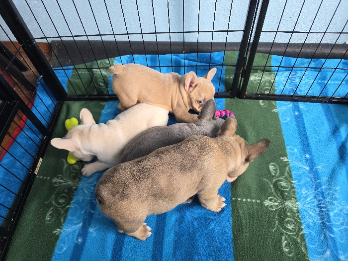 - "Within the city of Dupnitsa, Bulgaria, an indoor scene depicts four French Bulldog puppies contained within a black metal wire playpen" by FM-moJH62, licensed under CC BY 4.0