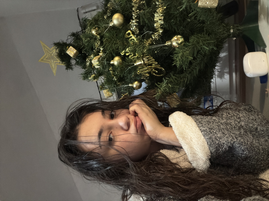 A person poses in front of a decorated Christmas tree. The tree features gold ornaments, garland, and a star on top. The person has long, dark, wavy hair and is wearing a gray and white sweater. They rest their chin on their hand, looking at the camera with a slightly somber expression. The background is a light gray wall.