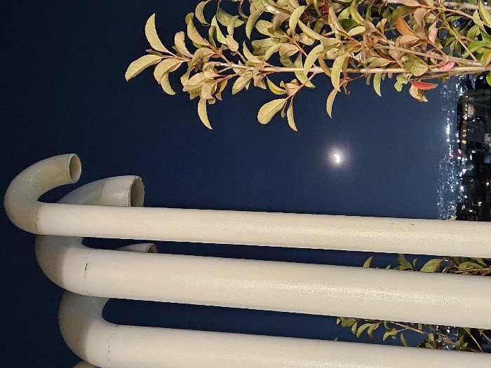 The image displays a nighttime scene overlooking the city of Mexico City, Mexico, from an elevated perspective. In the foreground, positioned on the left, are three tall, light-colored (off-white or cream) industrial pipes, each curving at the top in a U-shape, with their open ends directed downwards. These pipes exhibit a slightly textured surface. On the right side of the foreground, a leafy plant with green and reddish-brown ovate leaves partially obstructs the view. The background consists of a dark blue night sky, featuring a visible crescent moon in the upper-right portion. Below the moon and plant, the sprawling urban landscape of Mexico City is visible, illuminated by numerous scattered artificial lights from buildings and infrastructure. Dark, undulating terrain, consistent with hills or mountains, is discernible on the distant horizon.