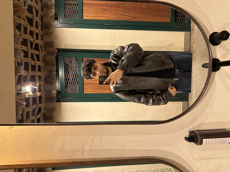 A male individual is depicted from mid-thigh to the top of his head, reflected in an oval-shaped mirror with a dark frame. He has dark, curly hair and a short beard. He is wearing a dark brown or black leather bomber jacket over a black ribbed sweater and dark blue jeans, with his left hand in his pocket. He is holding a black smartphone in his right hand, angled towards the mirror, obstructing the lower part of his face. The reflected background behind the individual features two dark green-trimmed wooden panels, possibly doors, each with a decorative, patterned mesh above the wood. Above these panels, a ceiling is adorned with a large, woven rope net pattern featuring tassels along its lower edge, and a single light fixture is visible within the net. The surrounding walls are light beige and textured. In the immediate foreground, outside the mirror's reflection, a light-colored countertop is visible, equipped with two black faucet handles. To the left, a dark brown pump dispenser is mounted on the wall. A partial view of another mirrored surface or similar curved object on the far left edge reflects a blurred green pattern. The setting is an indoor space, likely a commercial or public restroom. The location in Tsamakaberd, Armenia, cannot be confirmed from the visual evidence.