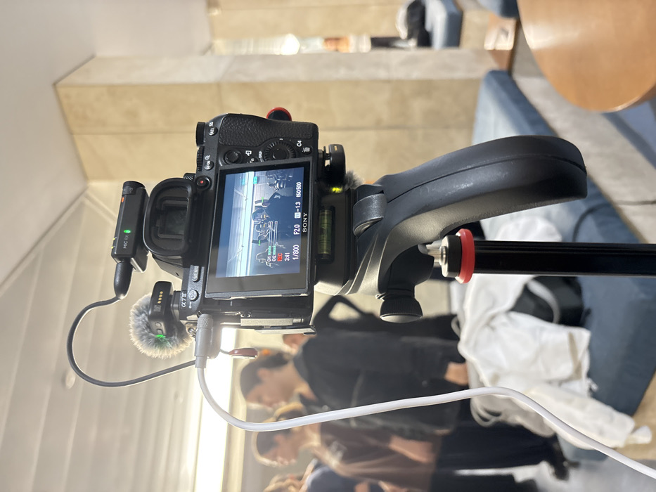 A Sony camera sits atop a tripod, its screen displaying a scene of multiple figures