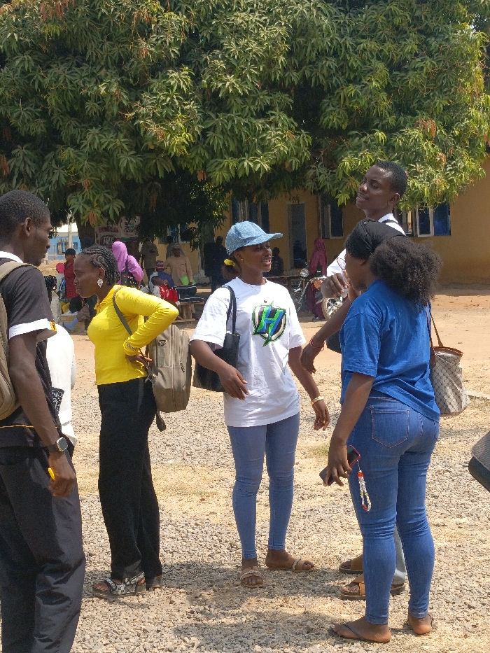 The image captures an outdoor scene in Keffi, Nigeria, featuring six individuals gathered on a light-colored gravel ground. A large, dense-leafed green tree dominates the mid-background, providing shade. Behind the tree, a light brown building with multiple blue-shuttered windows is visible, along with glimpses of other structures and distant figures. In the foreground, from left to right: 1. A male in a black t-shirt with white accents and dark trousers, wearing a light brown backpack, faces right, looking towards the female in yellow. 2. A female in a bright yellow long-sleeved top, black wide-leg trousers, and multi-colored sandals, carries a dark brown backpack. She stands with hands on her hips, facing left towards the male. Her hair is braided. 3. A female wears a white short-sleeved t-shirt with a green and black "H" logo, a light blue denim cap, light blue skinny jeans, and light brown flat sandals. She carries a black shoulder bag and faces right, looking towards the female in blue. A yellow tie is visible in her hair. 4. A male in a white collared shirt with black backpack straps is visible behind the previous two individuals, facing left and looking down towards the women. 5. A female in a blue short-sleeved t-shirt, blue skinny jeans, and brown flat sandals holds a dark-colored smartphone with a colorful beaded lanyard. She carries a patterned shoulder bag and faces left, looking towards the female in the white t-shirt. Her hair is dark and curly. 6. A sixth individual is partially visible on the far right, showing only the lower legs in light-colored trousers and dark footwear, along with a hand. In the background, behind the main group, several blurred figures are present, some appearing to be sitting. A motorcycle is also partially visible near the brown building. The scene is illuminated by bright daylight.