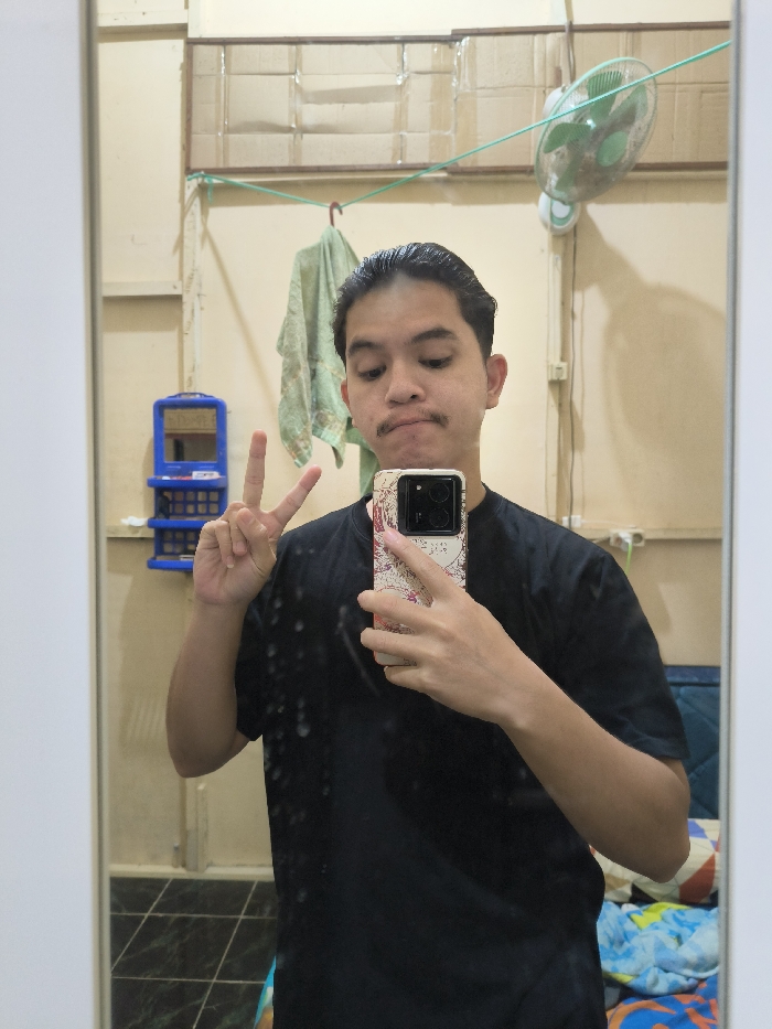 A male individual, appearing to be a young adult with dark, slicked-back hair and a mustache, is depicted from the chest up, reflected in a mirror. He wears a black t-shirt. His left hand is raised, forming a "peace sign" with extended index and middle fingers. His right hand holds a smartphone, equipped with a prominent camera module and a light-colored, patterned case, positioned to capture the mirror selfie. The individual exhibits a slight pout. The background, also reflected, reveals an indoor setting with light-colored walls and visible wooden trim. A small, light green wall-mounted fan, displaying visible dust, is affixed to the upper right wall. To the left of the fan, a light green towel hangs from a red hook. Below the towel, a blue plastic tiered shelf unit is visible. A portion of the wall above the shelf unit appears to be covered with cardboard. The floor consists of dark square tiles. A blue and white patterned fabric is partially visible in the lower right corner of the reflection. This scene takes place in Gampongteungoh, Indonesia.