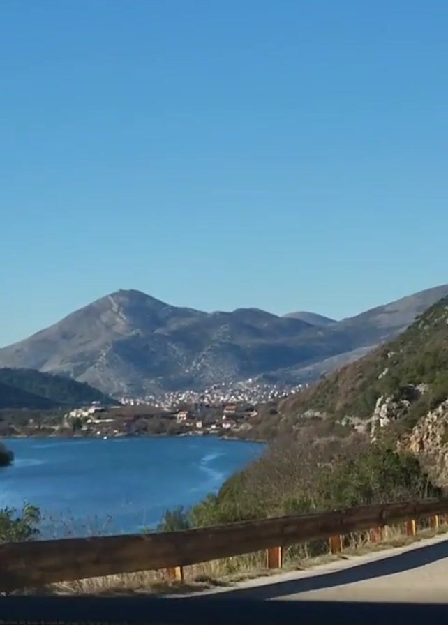 The camera captures a view from inside a car driving on an asphalt road. A rusty guardrail lines the side of the road, separating it from a body of water. The water leads toward a town nestled at the foot of a prominent mountain range. The sky is clear and bright blue. The overall view suggests a sunny day along a scenic route.