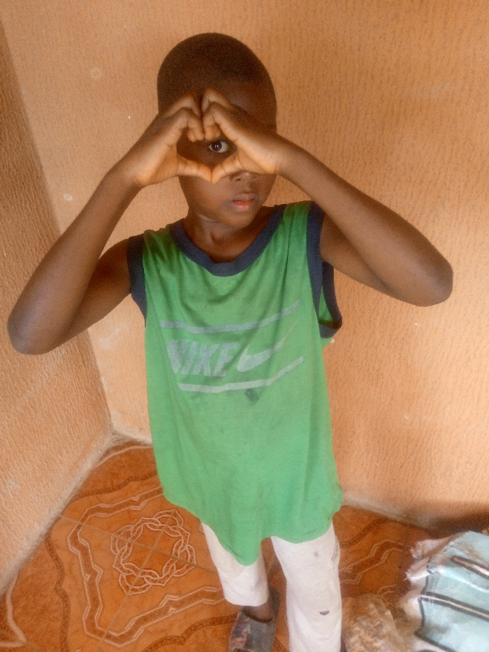A young male child stands in the corner of a room in Zango-ndaji, Nigeria. The child, with dark skin and a short haircut, wears a green sleeveless top featuring a faded grey "NIKE" logo on the chest, light-colored trousers, and dark, open-toed slides. He holds his hands together, forming a heart shape directly in front of his eyes, with his right eye visible through the opening. The background consists of textured, orange-brown walls meeting in an interior corner. The floor is covered with orange-brown tiles adorned with a repeating light-colored geometric pattern. An indistinct light-colored object rests on the floor in the lower right corner.