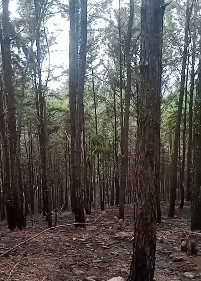 view through a dense forest of tall, thin trees with dark bark