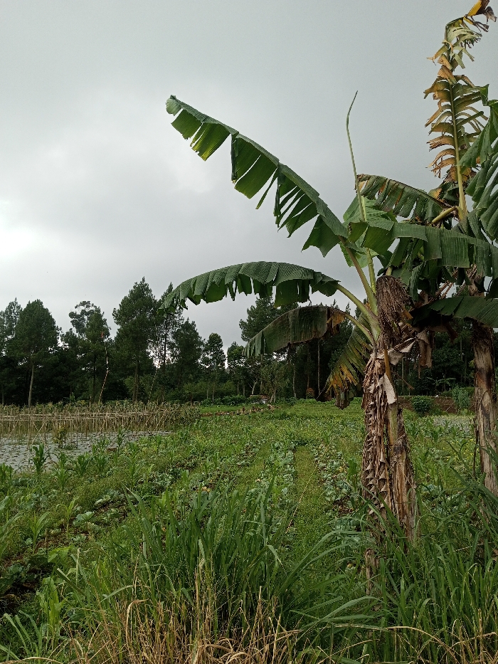 The image displays an agricultural scene in Kondha, India, under a uniformly overcast, light gray sky. In the immediate right foreground, a banana plant stands vertically, featuring large, green leaves, some appearing tattered or partially dried, and a trunk encased in dried brown leaf sheaths. A second, smaller banana plant trunk is partially visible behind it. The ground in the immediate foreground is covered by a mix of tall green and dry grasses. The midground presents a cultivated field with discernible rows of low-lying green crops. To the left of the field, a body of water contains scattered aquatic vegetation and a rudimentary structure composed of bamboo or wooden poles extending horizontally across a segment of the water. The background consists of a dense line of tall coniferous trees, forming a dark green horizon against the cloudy sky. No human subjects or discernible actions are depicted.