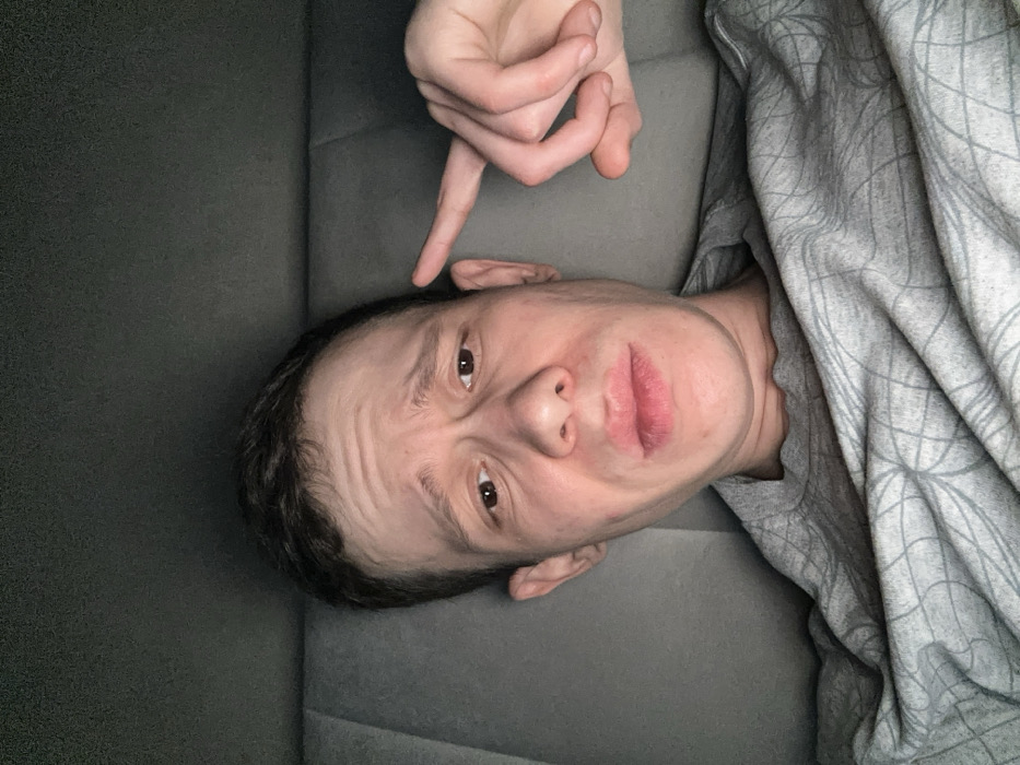 An image taken in Tashkent, Uzbekistan, shows a single male subject positioned in a supine or reclined orientation. The male, with short dark hair and a light complexion, looks directly at the camera with a facial expression characterized by raised eyebrows and a slightly puckered mouth, suggesting mild discomfort or questioning. He is wearing a grey short-sleeved top with a subtle geometric pattern. His right hand is raised, with the index finger extended and pointing towards or touching his right temple or ear, while the other fingers are curled. The immediate background consists of a dark grey, plain upholstered surface, possibly a vehicle seat or a piece of furniture, with a visible seam running horizontally behind his head. The lighting is low and appears to originate from an unidentifiable source, illuminating the subject's face. No other individuals or objects are discernible within the frame.