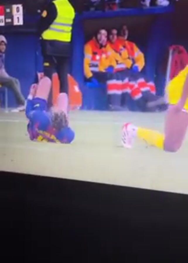 A video shows a soccer player wearing a blue and red uniform with the number 10 lying on the grass seemingly in pain