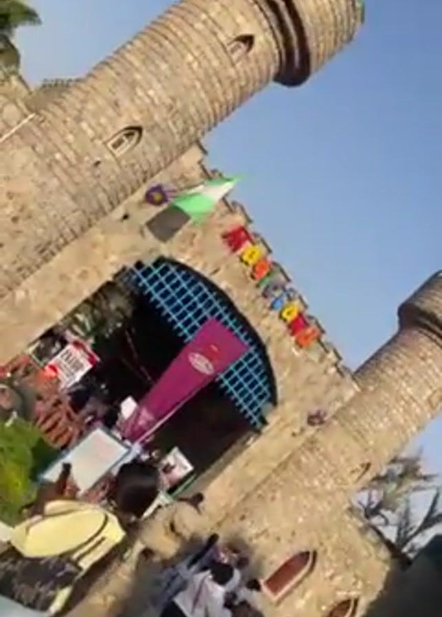 entrance to Magic Land. It is a castle-like structure with two towers on either side of the entrance. The words "Magic Land" are displayed in colorful letters above the gate. A Nigerian flag is visible on the left tower. People are gathered near the entrance, some are taking pictures. The sky is clear and blue.