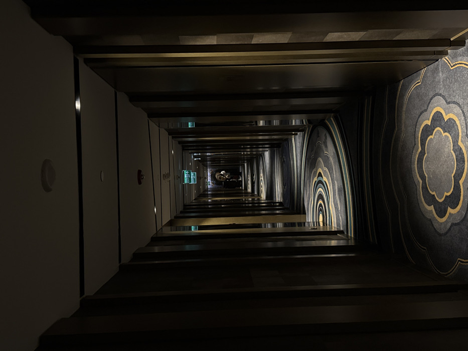 An enclosed hotel corridor creates a claustrophobic perspective. The left wall is lined with white doors, while the right features patterned carpet. Overhead, a coffered ceiling stretches into the distance. Diminishing perspective emphasizes the length of the corridor, culminating in a distant point where a figure is partially visible. Emergency exit signs are interspersed along the left wall. Overall, the composition conveys a sense of depth and confinement.