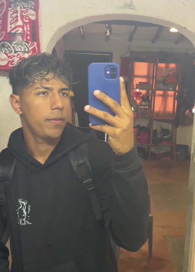 A young man wearing a black hoodie and backpack takes a selfie in front of a mirror. He has short, curly hair with frosted tips. He smiles slightly. The mirror reflects an arched doorway leading to another room with a shelf filled with items. A Coca-Cola branded bag hangs on the wall near the mirror. He says, "Ya me voy a mi casa a descansar." which translates to "I'm going to my house to rest."