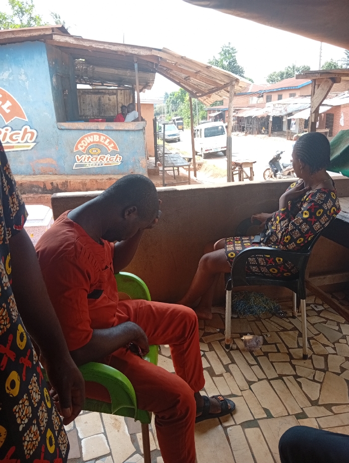 This image depicts a street scene in Umuoji, Nigeria. In the foreground, an adult male wearing an orange long-sleeved shirt and trousers is seated on a green plastic chair, his right hand covering his face, indicating distress or deep thought. He wears dark sandals. To his right, an adult female wearing a dark patterned dress with geometric motifs is seated on a black plastic chair, her right hand resting on her chest, observing the street. Her hair is styled in braids. A third individual is partially visible on the far left, wearing a dark patterned garment. The ground is paved with irregular light-colored tiles, partially shaded by an overhead structure constructed from wooden beams and corrugated material. In the mid-ground, a light blue concrete roadside shop with a wooden lean-to roof displays "COWBELL VitaRich" branding. Two individuals are visible seated inside this shop, facing outwards. Beyond the immediate seating area, a dirt shoulder transitions into a paved street. A white van, another white car, and a black motorcycle are present on or beside the street. Several makeshift wooden tables or stalls line the roadside. The background includes additional low-rise buildings and green trees under a bright sky. On the ground near the female's chair, a coil of blue wires and a small metallic object are present.