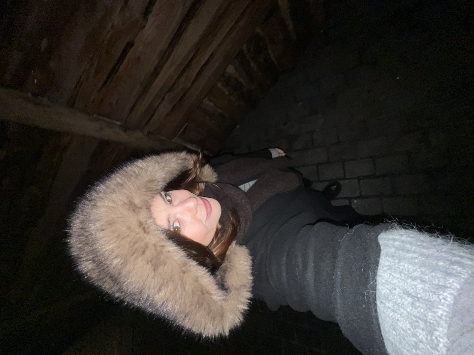 A woman wearing a fur-lined hood, a brown scarf, a black jacket, and grey gloves poses for a selfie. She is looking upward and smiling. The background consists of a ceiling constructed of dark wooden beams, and a wall made of dark bricks. The lighting is dim, creating shadows throughout the scene. The overall composition has a sense of being in an underground or enclosed space.
