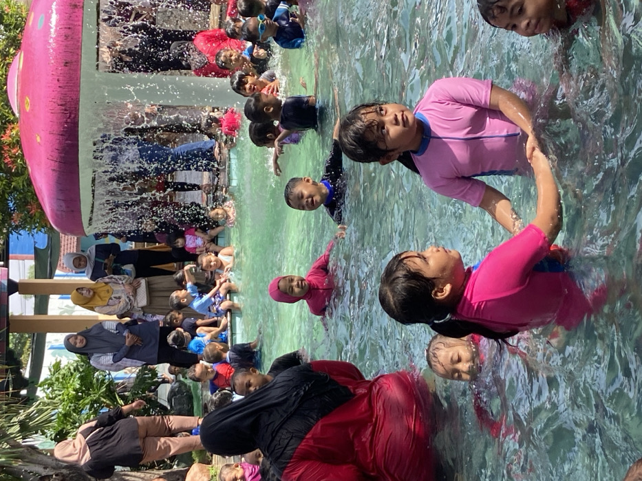 A vibrant scene unfolds at a water park. Children in colorful swimwear are enjoying the water, some under a mushroom-shaped water feature, others wading in the clear pool. Adult women wearing hijabs are observing the children from the poolside. The sun shines brightly, creating ripples and reflections on the water's surface, adding to the lively atmosphere.
