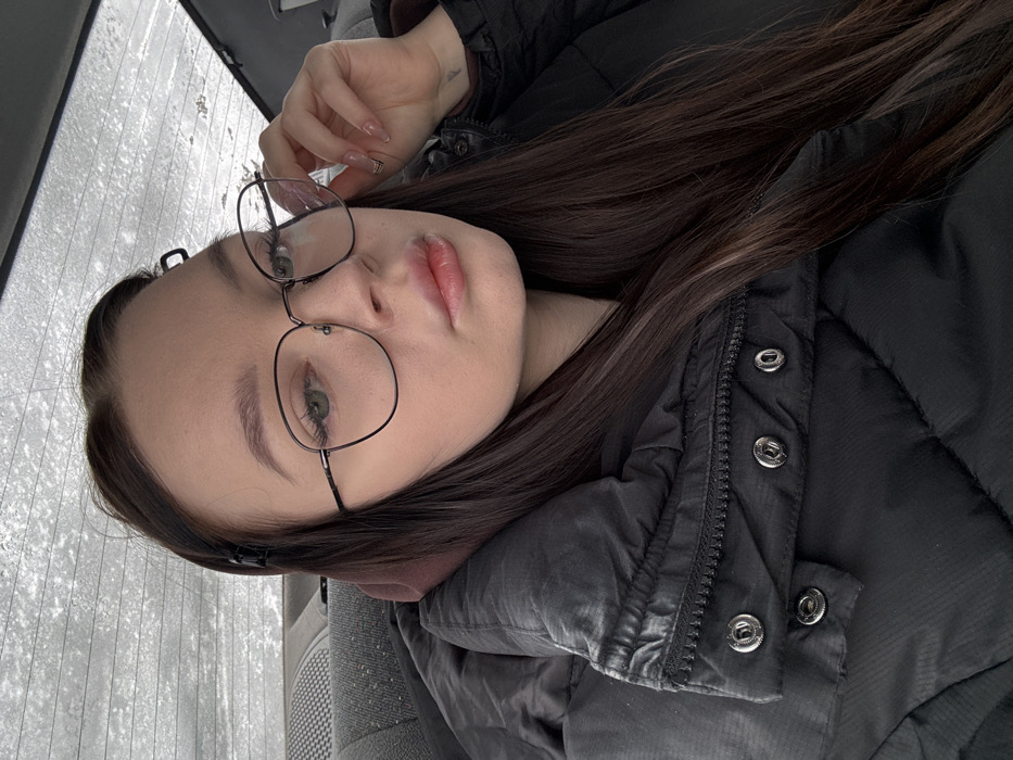 The image displays a young female subject seated in the rear passenger compartment of a vehicle in Severouralsk, Russia. She has long, dark brown hair, wears black-rimmed glasses, and is dressed in a black puffer jacket over a brown hooded garment. Her right hand, exhibiting manicured nails with light polish and a metallic detail, lightly touches the right temple of her glasses. A small dark hair clip is positioned in her hair above her left ear, and a faint tattoo is visible on her right inner forearm. Behind the subject, the vehicle's interior features a textured grey fabric seat. The rear window is visible, largely obscured by a layer of frost or frozen precipitation, indicating cold external conditions.