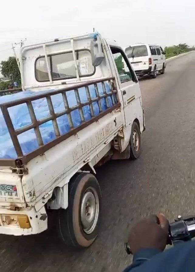A person is riding a motorcycle and filming a small white truck driving on a paved road. The truck is carrying many blue water bags. There is a white van driving ahead of the truck in the same direction. The road has a white line marking the edge and vegetation is visible on the side. The sky is overcast.