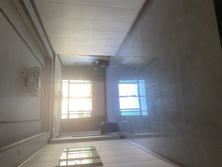 A brightly lit room features a wall with decorative molding and a chandelier. The room's back wall has a large window letting in sunlight. The shiny tiled floor reflects the window's light. A plant sits in a pot on the back wall. A blue container and a black bag sit on the floor near a vent.
