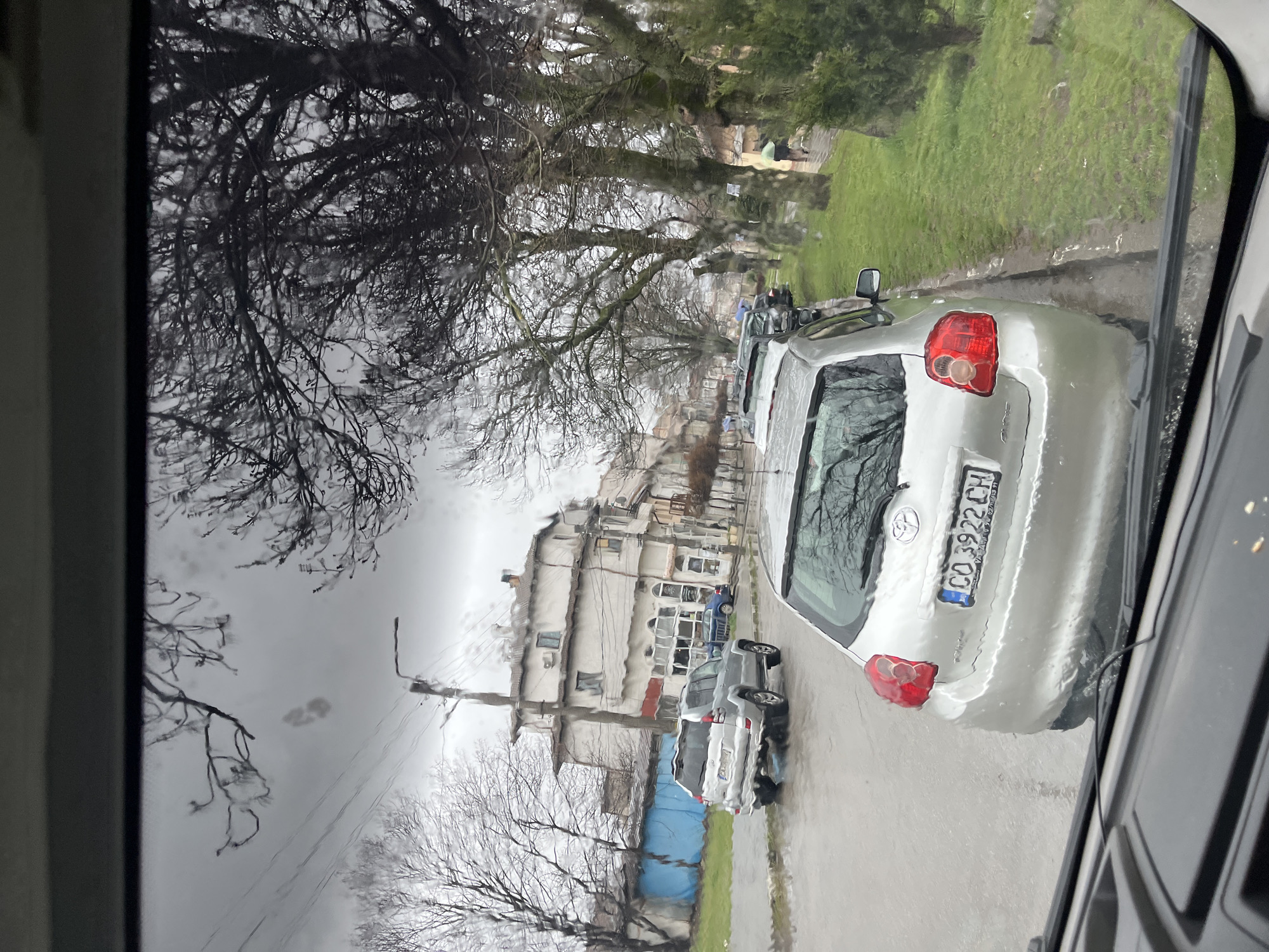 street scene in Ihtiman, Bulgaria, as viewed through a rain-streaked car window