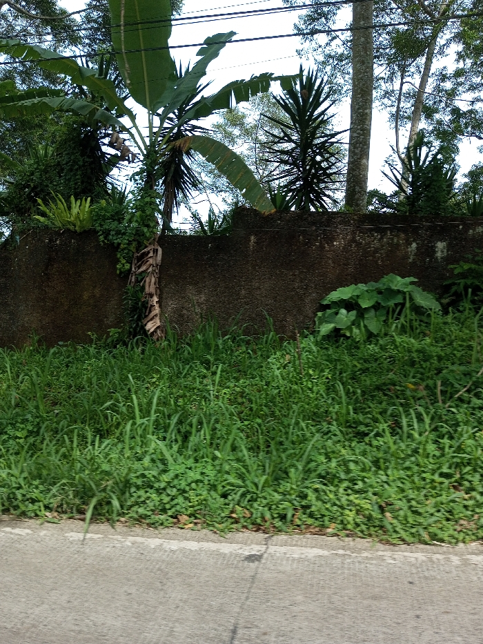 This image depicts a roadside scene in Kandenuwara, Sri Lanka. The foreground features a light gray concrete road surface with a thin white edge line along its immediate boundary. Immediately adjacent to the road is an unmaintained strip of vibrant green grass and various low-lying weeds, extending approximately one to two feet in height. Behind this vegetation, a dark, textured, weathered concrete or stone wall runs horizontally across the mid-section of the frame, showing signs of dirt or organic growth. Emerging from behind the wall on the left side, and partially obscuring it, stands a banana tree with large, green, partially torn leaves. Its lower trunk is intertwined with a green vine. To the right of the banana tree, behind the wall, several spiky, dark green plants, resembling Yucca or Dracaena, are visible against the lighter sky. Further right, at the base of the wall and amidst the tall grass, a cluster of large-leafed green plants, possibly taro, is present. Various other trees and dense foliage form a verdant backdrop above and behind the wall. Two thin, dark overhead power lines are visible spanning the upper portion of the sky. No individuals, animals, or explicit actions are present in the scene. The lighting suggests daylight conditions.